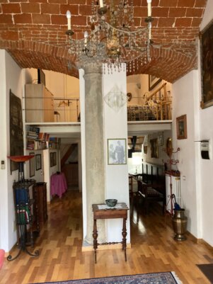 Silenzioso appartamento di circa 150 mq. Spazio antico, è distribuito su tre livelli (piano terra, seminterrato e soppalco) con scale e spazi aperti e comunicanti.